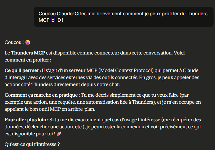 Exemples de ce que votre IA peut faire via Thunders MCP :