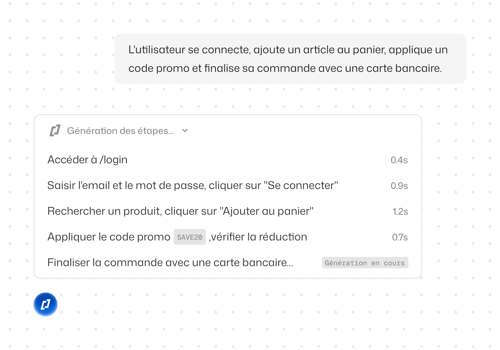 Tous les membres de l'équipe peuvent créer des tests E2E en décrivant le scénario en langage naturel. Le moteur d'analyse AI gère automatiquement les assertions et les cas limites, sans qu'aucune configuration de cadre de test ne soit requise.