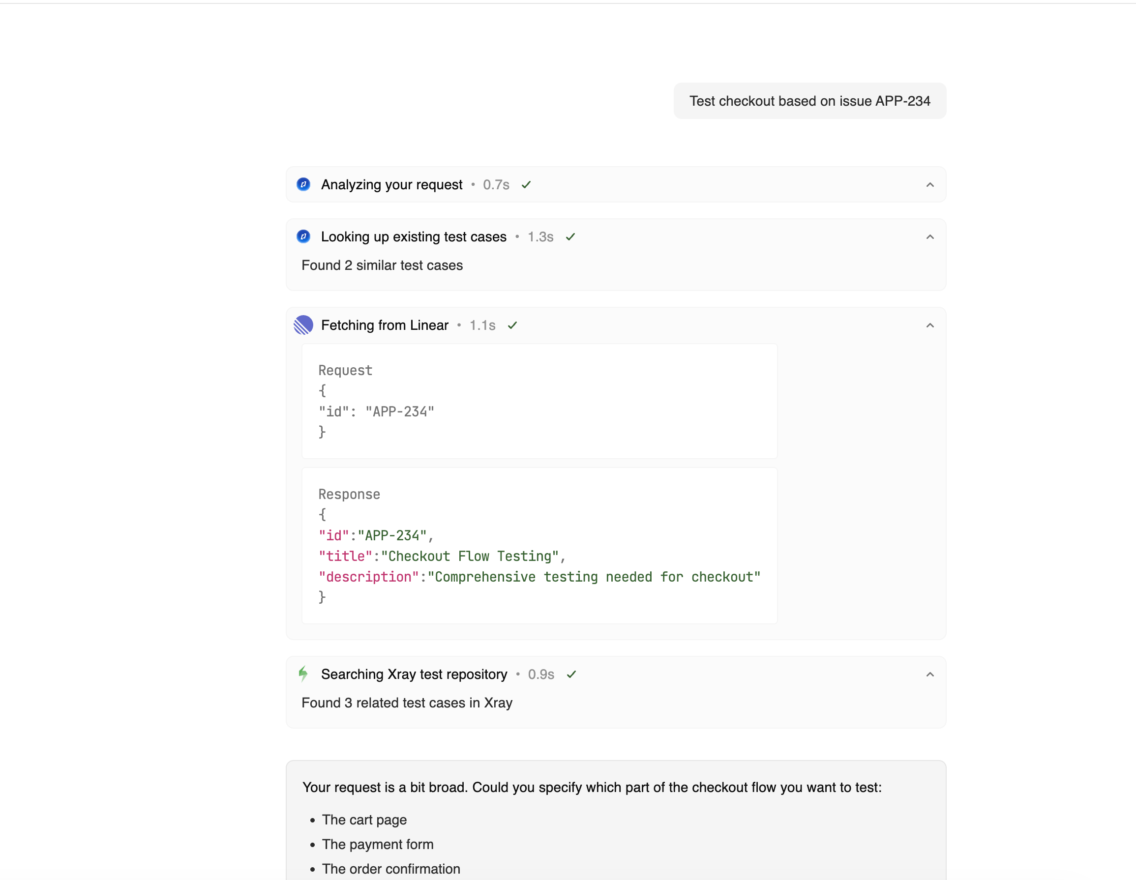 Indiquez à Thunders Copilot les tests à intégrer : par plan de test, set de tests, histoire ou épopée. Il lit les définitions des tests, comprend les étapes et les résultats attendus, et crée des cas de test Thunders avec une traçabilité complète jusqu'à Xray.