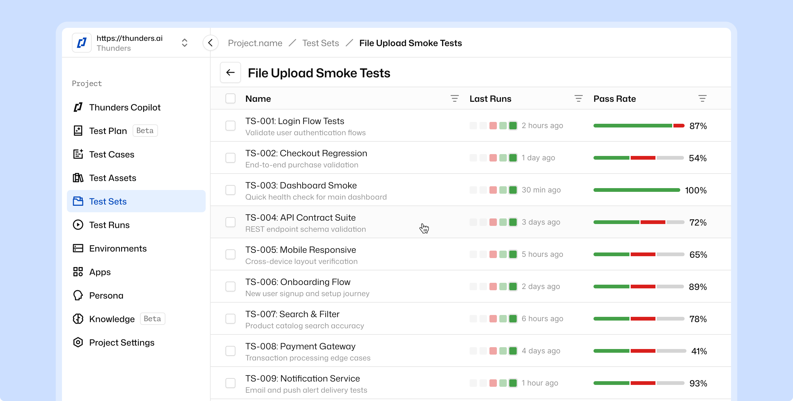 Set quality gates on your highest-value tests - checkout, login, core API responses. If a critical flow fails, Thunders exits with a non-zero code and the pipeline stops. No human needed to catch it.