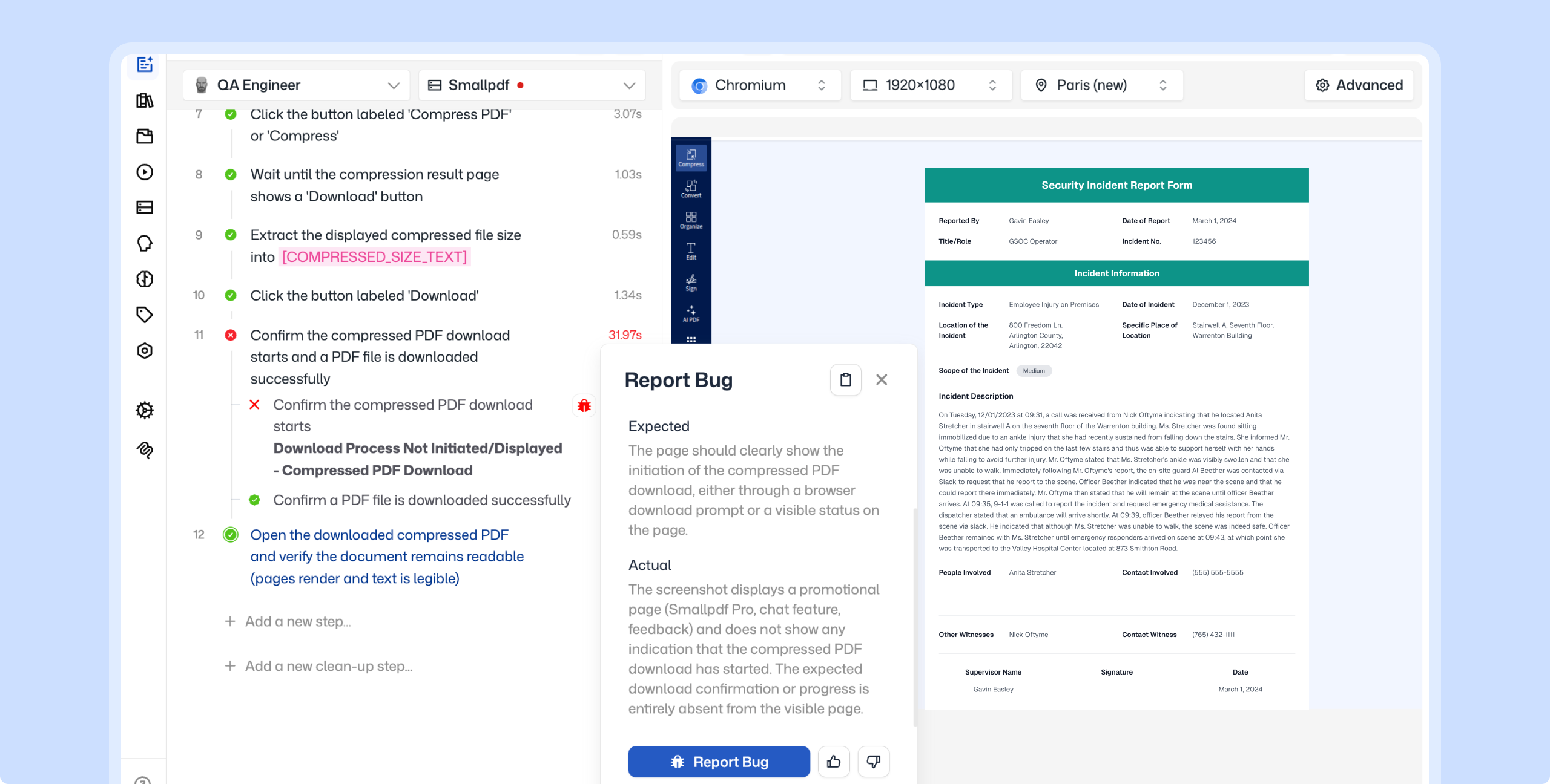 Product and engineering need to know where quality stands before the release. Export execution results as a shareable report with step outcomes - screenshots - and pass/fail summary. Ready to share - no manual assembly.