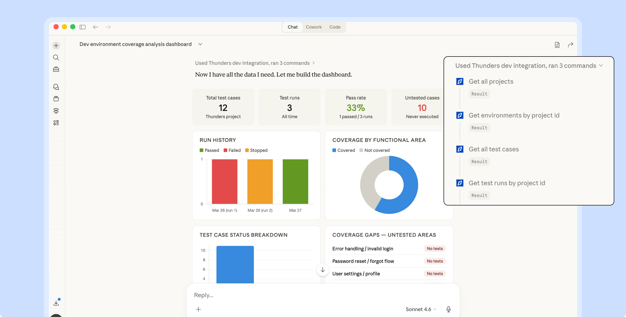Product managers need to know what is tested. Engineering leads need pass rates and failure trends. Instead of building dashboards manually - connect any MCP client (Claude - ChatGPT - Cursor) to Thunders MCP. Ask questions in natural language: what features are untested - which test sets are failing - where the gaps are. The answer comes from live data - not a static report.