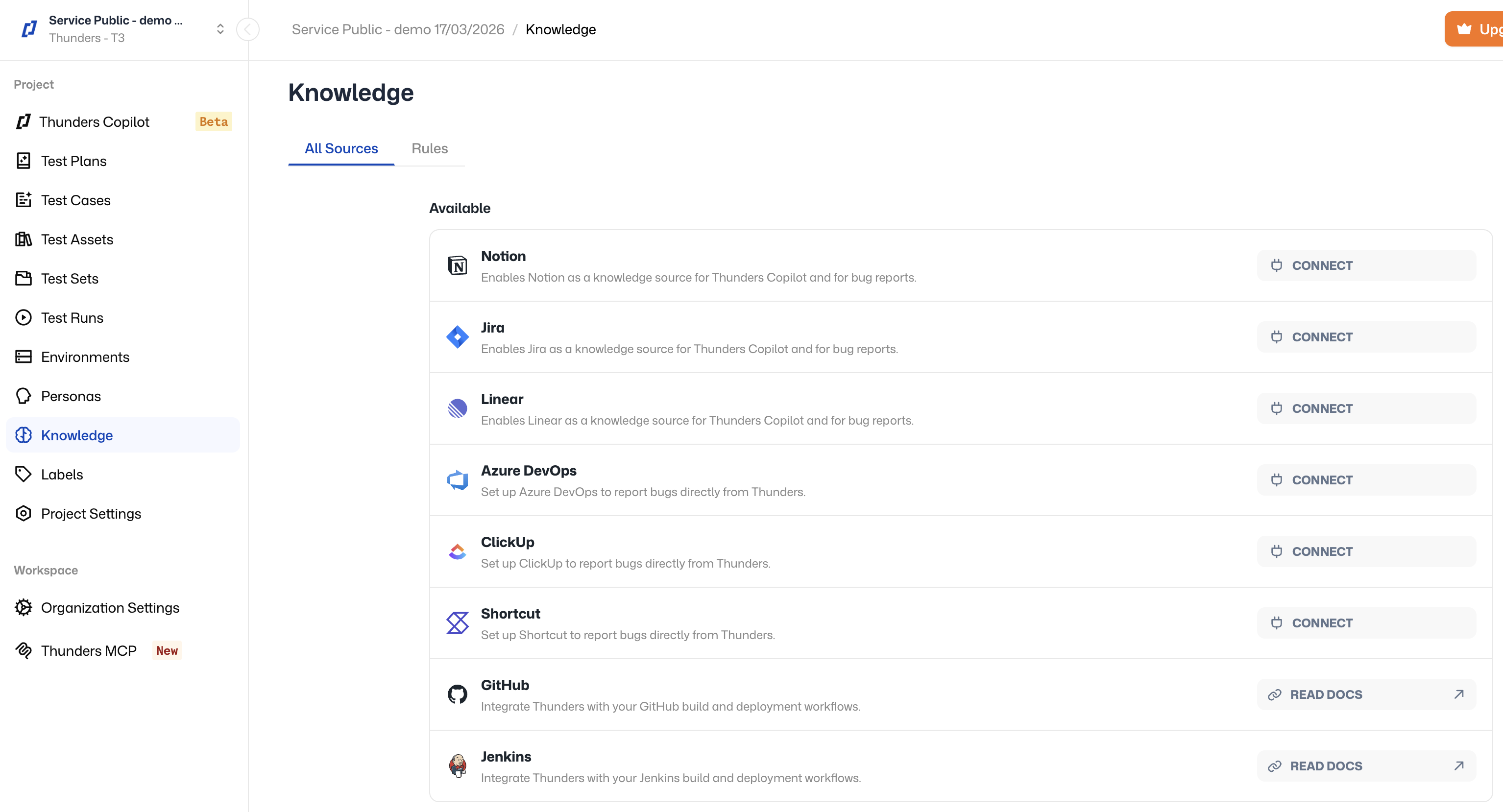 Go to Knowledge > All sources. Connect your Atlassian account. Thunders gets access to your workspace. For bug reporting, you choose which project the bug lands in.